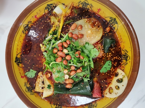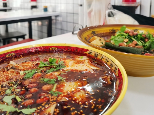 在通渭这个低调的西北小城,随处可见的起眼或者不起眼的街边小店,它们悄悄把麻辣烫这种国民小吃的形制,发挥到了一种极致。本地洋芋片、各色丸子、时令蔬菜……各类本地菜蔬肉丸经烫煮后捞出配一碗晶莹剔透的本地地道粉条,再在盘子里均匀地裹满香浓的油泼辣子,热辣鲜香瞬间在空气里“横行霸道”,一碗地道的麻辣烫里,翻滚着“土生土长”在通渭的各色风物,精准“拿捏”食客味蕾,带给大家满满的人间烟火气。