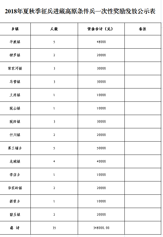 通渭县2018年夏秋季征兵进藏高原条件兵一次性奖励发放公示表