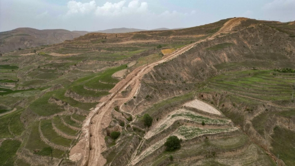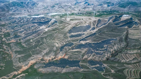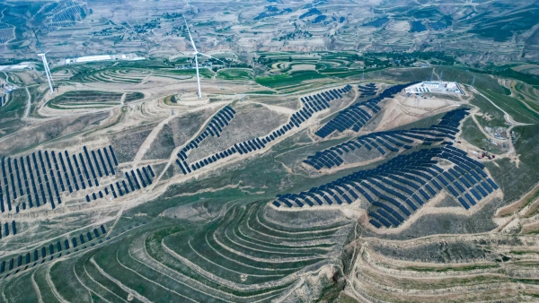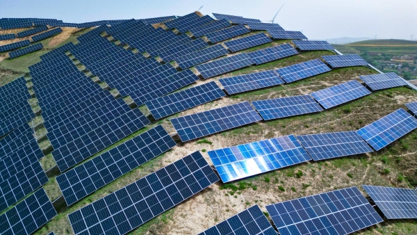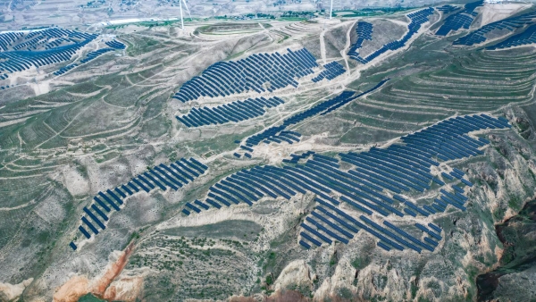 在马营镇向阳的山头,远远望去,绿色的山野中点缀着蓝色的光伏板,连绵成片。一排排光伏板整齐划一,构筑起错落有致的“发电梯田”,照亮乡村振兴之路。