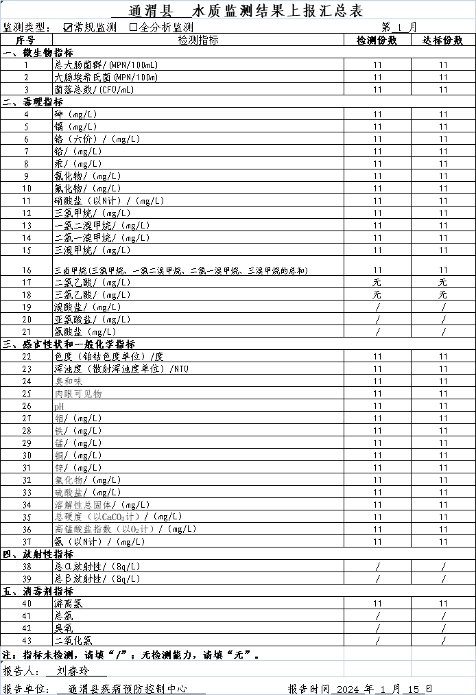 2024年1月份通渭县城区生活饮用水检测结果公示