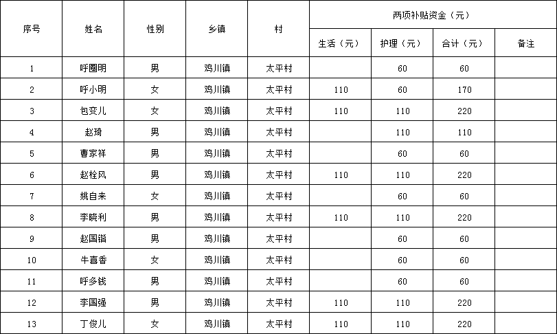 太平村2024年10月份残疾人“两项补贴”资金发放花名册