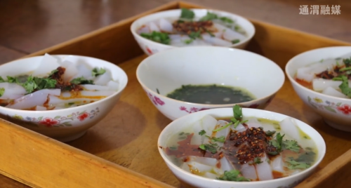据传,通渭凉粉已经有一千多年的历史了,宋孟元老《东京梦华录》称北宋时汴梁已有“细索凉粉”,以荞麦仁(去皮的荞麦粒)为原料。通渭人最喜欢吃的是浆水凉粉。把凉粉切成条或块,或用特制的凉粉搂子刮成长长的细凉粉条儿。在热锅内倒入胡麻油少许,待油沸后放入碎葱花,把浆水倒入锅内,待浆水开了后舀到切好的凉粉中,加入辣椒油、油炸蒜泥、韭花等调料,即可食用。光滑鲜香,清爽可口,是夏季消暑、开胃的最佳食品。另外还有鸡汤凉粉。凉粉还是制作安定粉汤、渭源烩菜、陇西大菜、通渭五花菜的配料。制作粉汤时把凉粉切成方形、条形或菱形薄片,大小以两指见方为宜,薄厚以一筷子头为好。烩菜时放入,粉嘟嘟如艳花初绽,颤巍巍似美女拜月,白中透青泛红,红绿相间的粉块如水晶般晶莹剔透,令人垂涎欲滴。在盛夏天或特殊的日子里,也可用洋芋粉面子勾成粉芡,用同样的方法做成洋芋凉粉。此时或是调入浆水,或是用醋、酱等汁相拌,再配上用胡麻油制成的辣子,未入口时香味扑鼻,入口之时嫩爽即化,清凉至极。