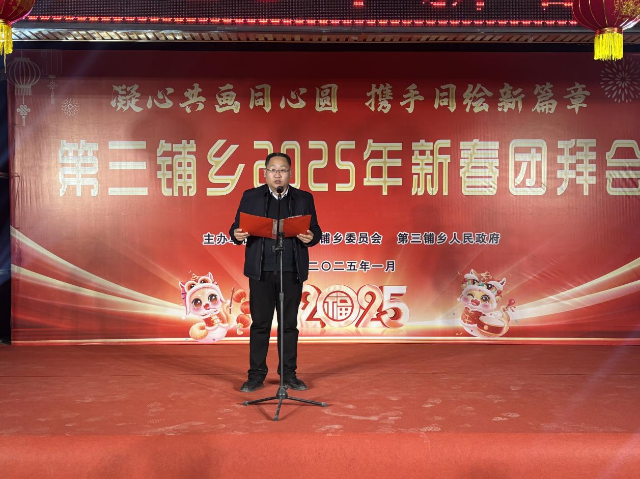 祥龙摆尾辞旧岁,瑞蛇昂首启新程。春节将至,为丰富乡村文化生活,增添节日气氛,营造积极向上是新春文化氛围,增强乡村干部的凝聚力战斗力,1月23日下午,第三铺乡举办2025年“凝心共话同心圆,携手同绘新篇章”新春团拜会联谊晚会,全体乡村干部、乡直各单位、驻村帮扶工作队等150余人欢聚一堂,共话发展,畅想未来。 回顾成就,展望未来