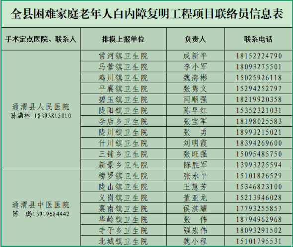 为全面贯彻落实甘肃省2025年10件为民实事项目,确保全县困难家庭老年人白内障患者得到及时帮扶救助,根据定西市卫生健康委员会《关于印发万名困难家庭老年人白内障复明工程实施方案的通知》要求,确定县人民医院和县中医医院为困难家庭老年人白内障患者筛查及手术定点医院,现将开展“困难家庭老年人白内障复明工程”筛查及手术实施具体安排如下:全县范围内符合手术条件的困难家庭老年人白内障患者(原则上矫正远视力低于0.3)。1.最低生活保障对象;2.特困人员;3.防止返贫监测对象;4.最低生活保障边缘家庭成员等。1.筛查时间:2025年3月10日—2025年5月30日(上午8:00-12:00、14:30-17:30,双休及节假日除外)。2.筛查地点:县人民医院门诊楼2楼眼科、县中医医院门诊楼4楼眼科。主要包括视功能检查、眼压测量、眼底检查、手术意愿及健康状况等。全县范围内所有符合条件的白内障患者均可参加筛查。所有筛查对象需携带本人身份证或户口本、社保卡(医保卡)到辖区乡镇卫生院开具介绍信(县人民医院筛查乡镇包括马营、鸡川、常河、平襄、陇川、碧玉、什川、陇阳、李店、新景、三铺;县中医医院筛查乡镇包括榜罗、陇山、义岗、北城、华岭、襄南、寺子)自行前往县人民医院门诊楼2楼眼科、县中医医院门诊楼4楼眼科进行筛查。1.经过专业医生初步筛查,确定是否需要进行手术。符合手术条件的患者,由县人民医院和县中医医院安排具体手术时间,实施白内障复明手术。2.符合手术条件的患者携带身份证和社保卡,按照安排时间前往县人民医院和县中医医院进行手术治疗。省级安排资金,按每人不超过1000元标准为实施复明手术的困难家庭老年人白内障患者予以补助,资金补助到定点医院,主要用于手术患者经医保报销后需个人自付部分的住院费用。