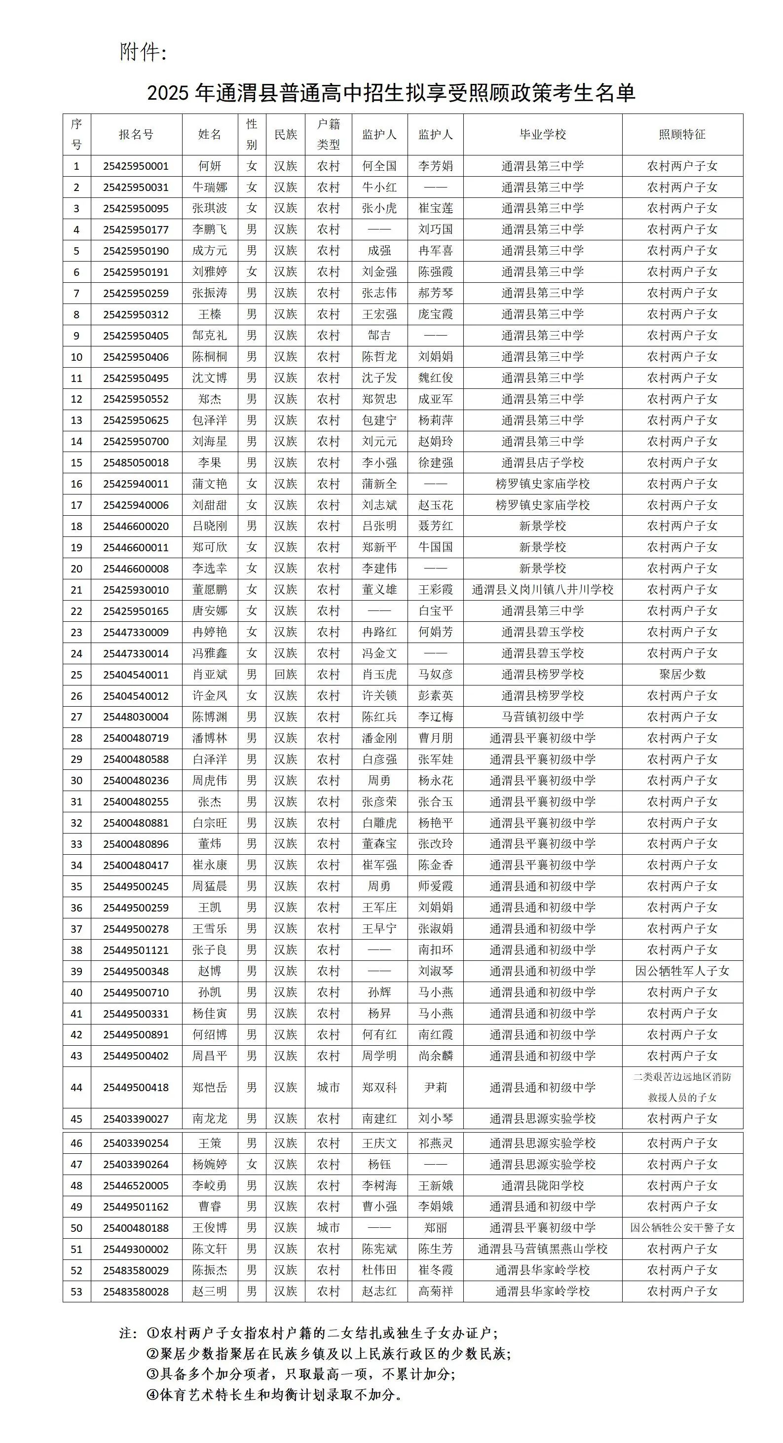 附件:2025年通渭县普通高中招生拟享受照顾政策考生名单