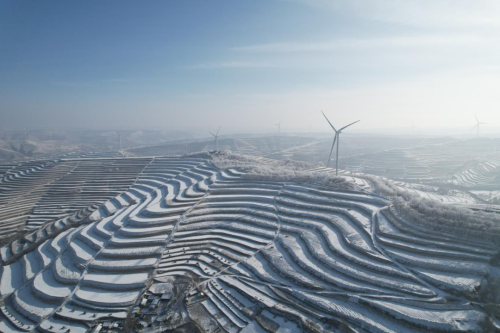 1月4日,冬阳微露。雪后的通渭县马营镇,千峰裹素,万木凝霜。往日错落的梯田,被白雪勾勒成银线蜿蜒;山巅风车静立,在澄澈天光下映着琼枝。