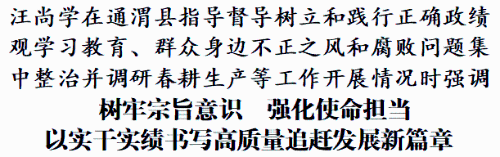 4月9日,市委书记汪尚学深入通渭县指导督导树立和践行正确政绩观学习教育、群众身边不正之风和腐败问题集中整治,并调研春耕生产等工作。他强调,要深入学习贯彻习近平总书记关于树立和践行正确政绩观的重要论述,树牢宗旨意识,强化使命担当,扎实推动学习教育、集中整治走深走实,加快推进各项重点工作落实,以实干实绩书写高质量追赶发展新篇章。